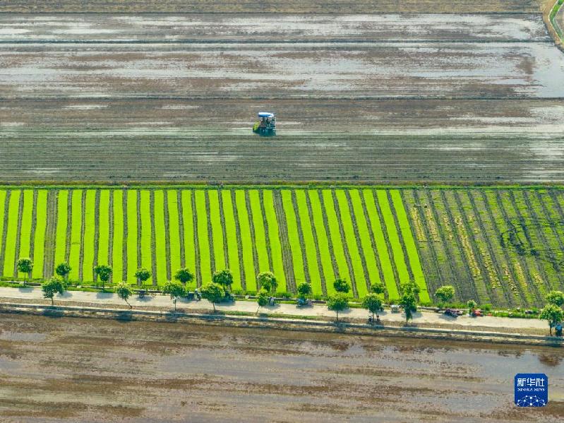 6月11日,在江蘇省興化市周莊鎮(zhèn)四美村,農(nóng)民駕駛農(nóng)機進行插秧作業(yè)(無人機照片)。