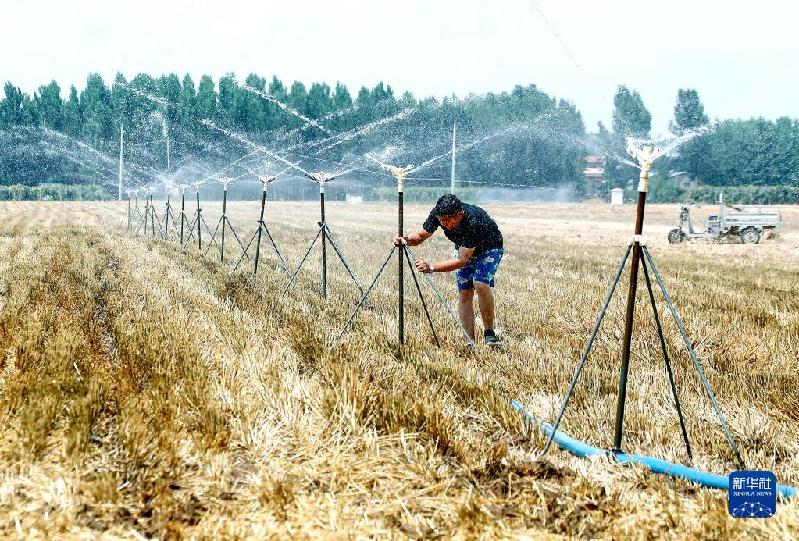 6月11日,河南省開封市尉氏縣蔡莊鎮(zhèn)時村的村民對收割后的麥田進行澆灌,準(zhǔn)備播種小秋作物。