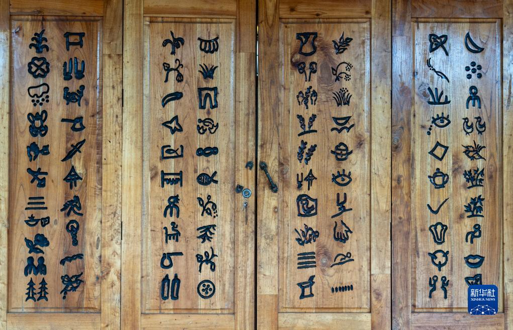 這是7月30日拍攝的刻在坡芽村坡芽傳習(xí)館門板上的81個(gè)“坡芽情歌”圖畫符號(hào)。