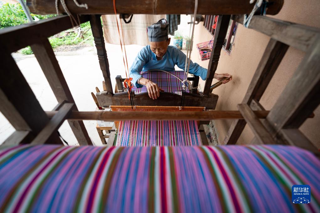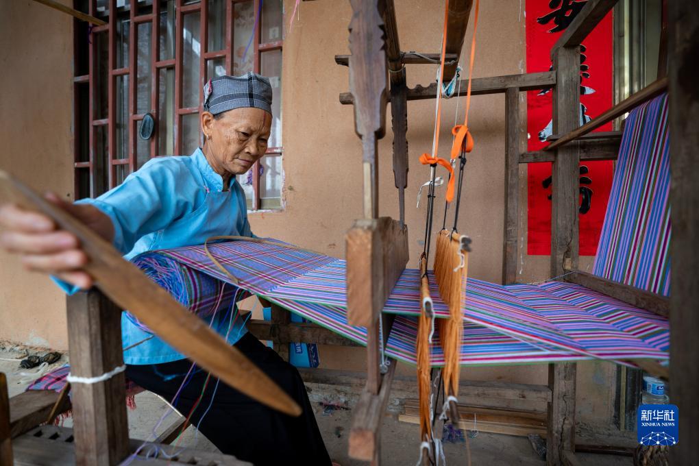 7月30日,一名坡芽村壯族村民在使用織布機(jī)織壯錦。