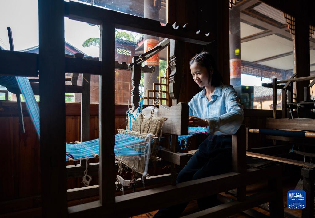 7月30日,一名游客在坡芽村坡芽傳習(xí)館內(nèi)體驗(yàn)壯族織布。