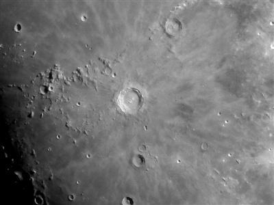 哥白尼環(huán)形山。采用改裝GoPro4接英田80APO天文望遠(yuǎn)鏡拍攝。摘除運(yùn)動(dòng)相機(jī)超廣角鏡頭,加接圈與小型天文望遠(yuǎn)鏡相連,可使拍攝倍率增加數(shù)十倍。