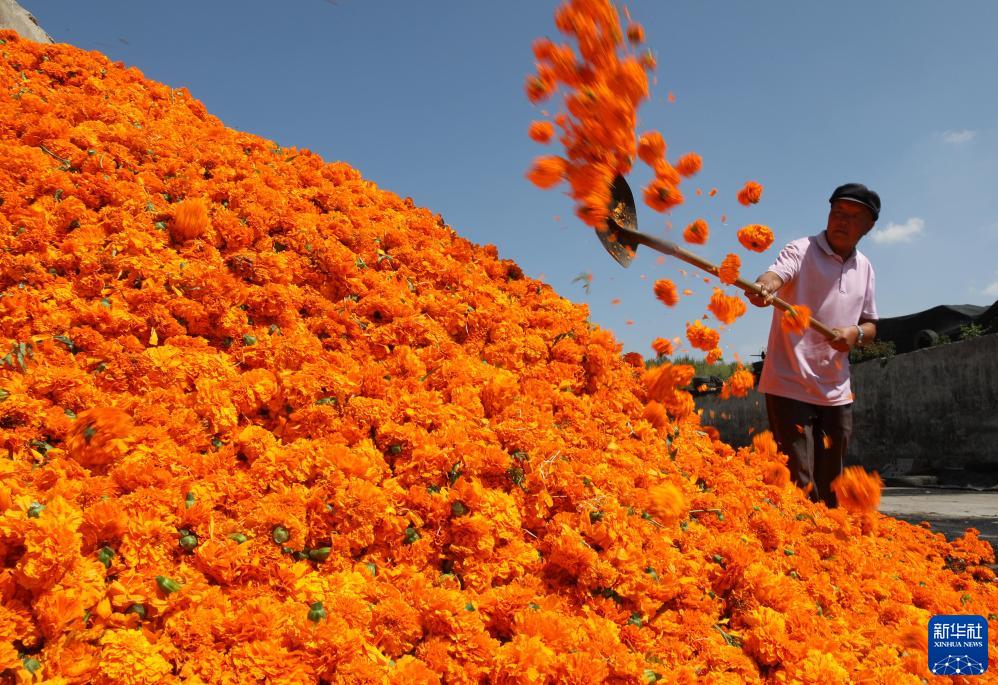 8月20日,在河北省平泉市平北鎮(zhèn)的萬壽菊花朵收儲基地,農民將剛剛采收的萬壽菊花朵進行集中收儲。