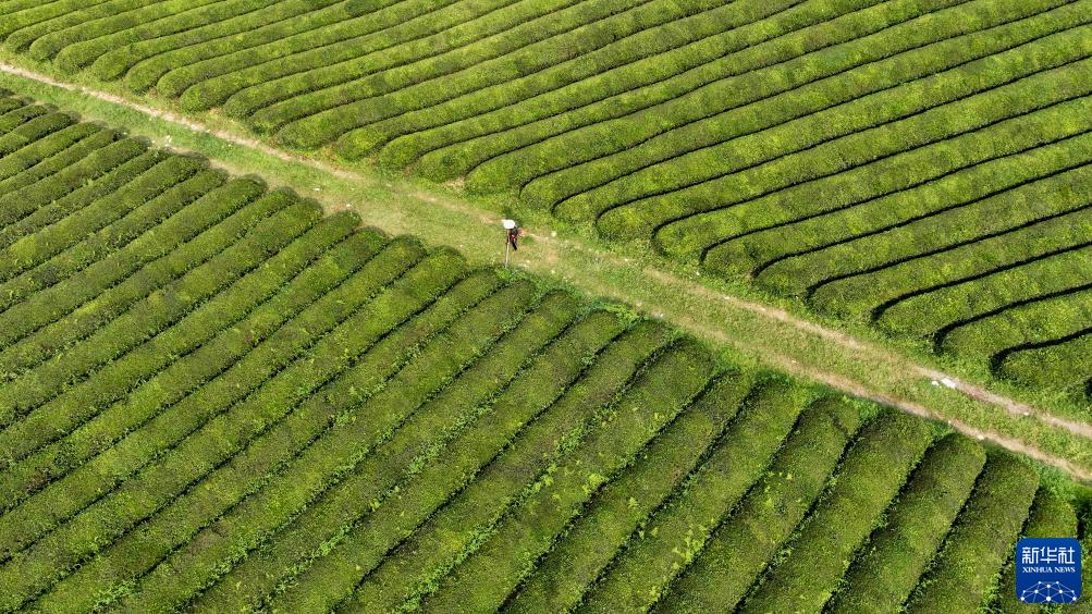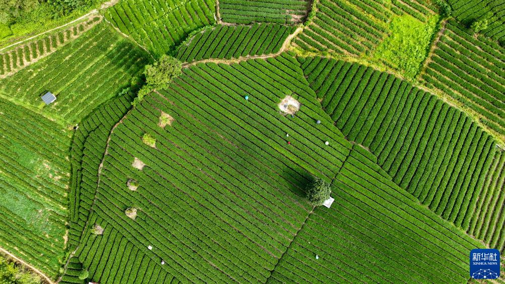 8月20日,茶農在貴州省遵義市湄潭縣永興鎮(zhèn)萬畝茶海管護茶園(無人機照片)。