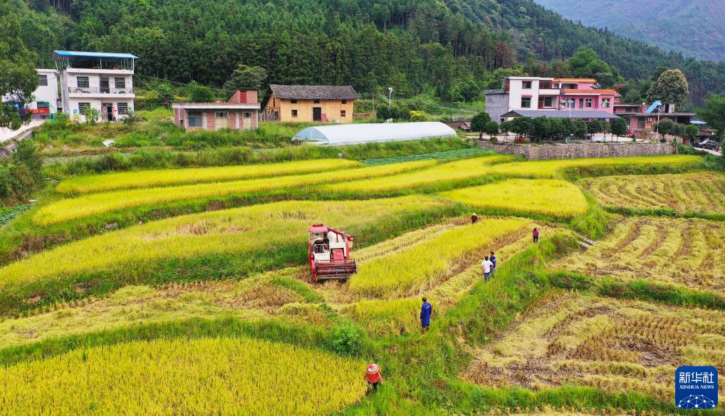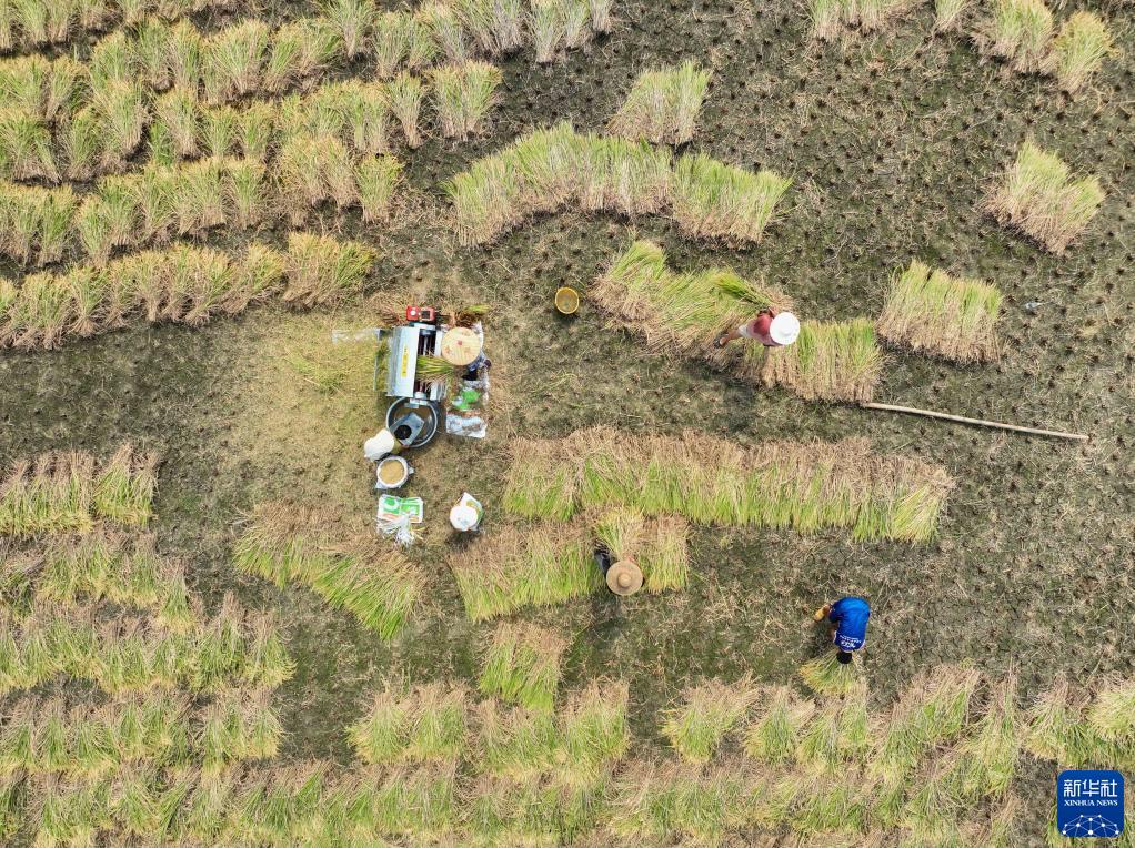 8月20日,在湖南省永州市道縣清塘鎮(zhèn)廖家村,農民在收獲水稻(無人機照片)。