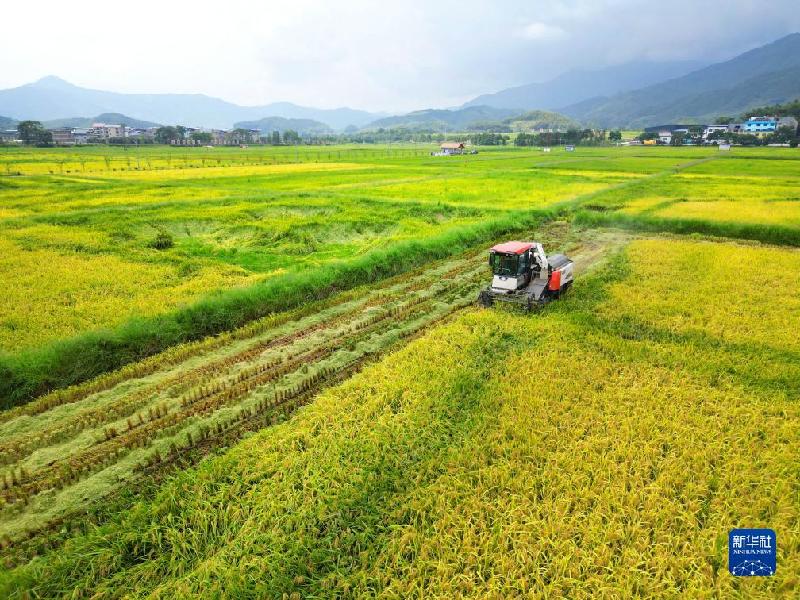 8月17日,收割機(jī)在福建省南平市浦城縣石陂鎮(zhèn)申明村田間收割水稻(無(wú)人機(jī)照片)。
