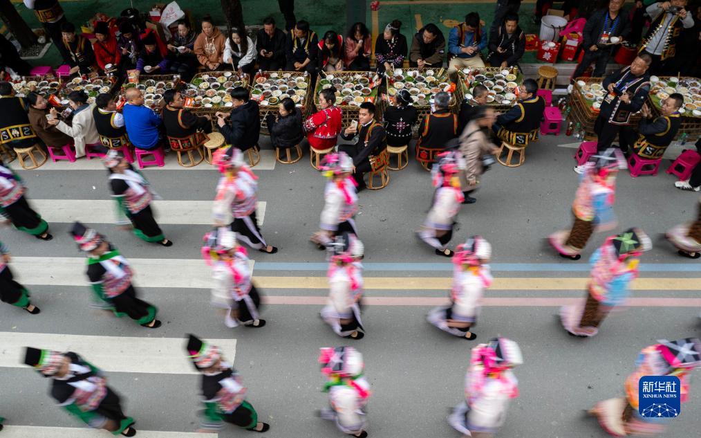 當日,云南省紅河哈尼族彝族自治州綠春縣舉行哈尼族長街宴活動。當?shù)毓嶙迦罕娚碇?jié)日盛裝,載歌載舞,與游客共慶2023云南·綠春哈尼十月年長街古宴文化旅游節(jié)。長街古宴是哈尼族“十月年”中的一個習俗,當?shù)厝罕娡ㄟ^長街古宴慶祝豐收、祈福納祥。
