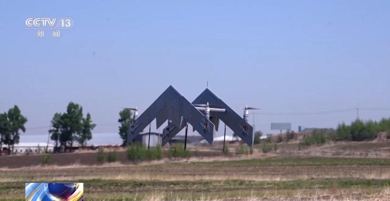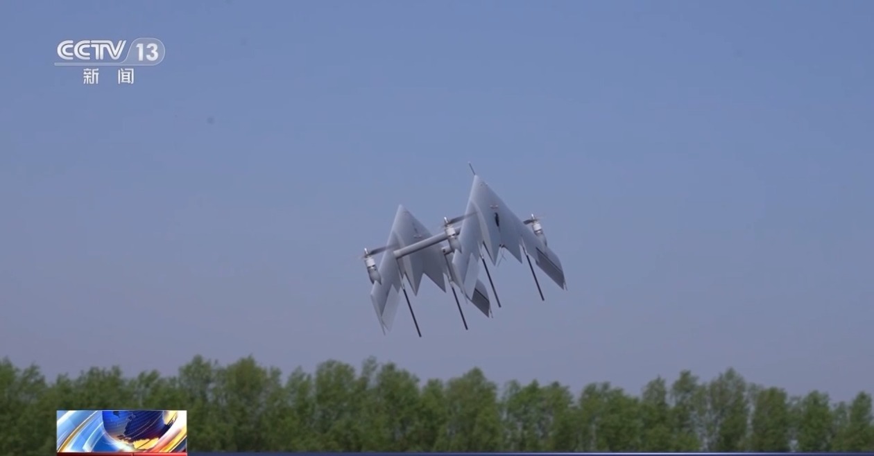 總臺(tái)央視記者褚爾嘉:現(xiàn)在在我面前這里就是一款全新的無(wú)人機(jī)類型,我們可以看到它由兩個(gè)固定的飛翼組成,它也是目前全球首創(chuàng)的一個(gè)雙飛翼垂直起降固定翼無(wú)人機(jī)。這款無(wú)人機(jī)它是可以實(shí)現(xiàn)豎直狀態(tài)下的一個(gè)垂直起降,起飛后,它又可以實(shí)現(xiàn)一個(gè)正常的平飛。