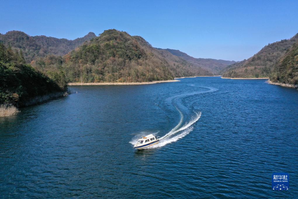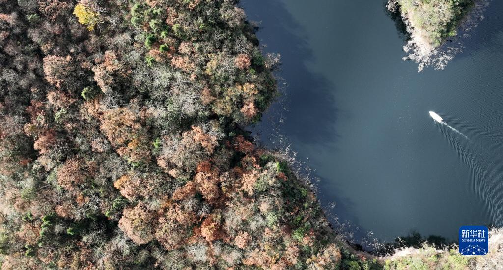 11月28日,貴州大沙河國(guó)家級(jí)自然保護(hù)區(qū)工作人員在湖面巡護(hù)(無(wú)人機(jī)照片)。