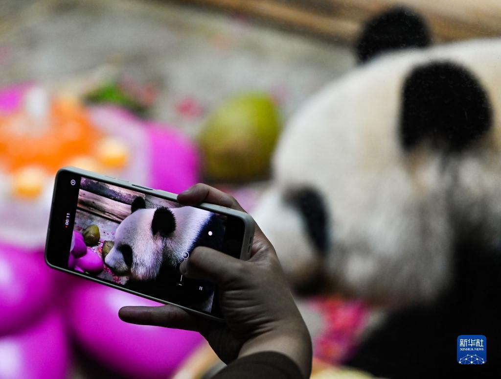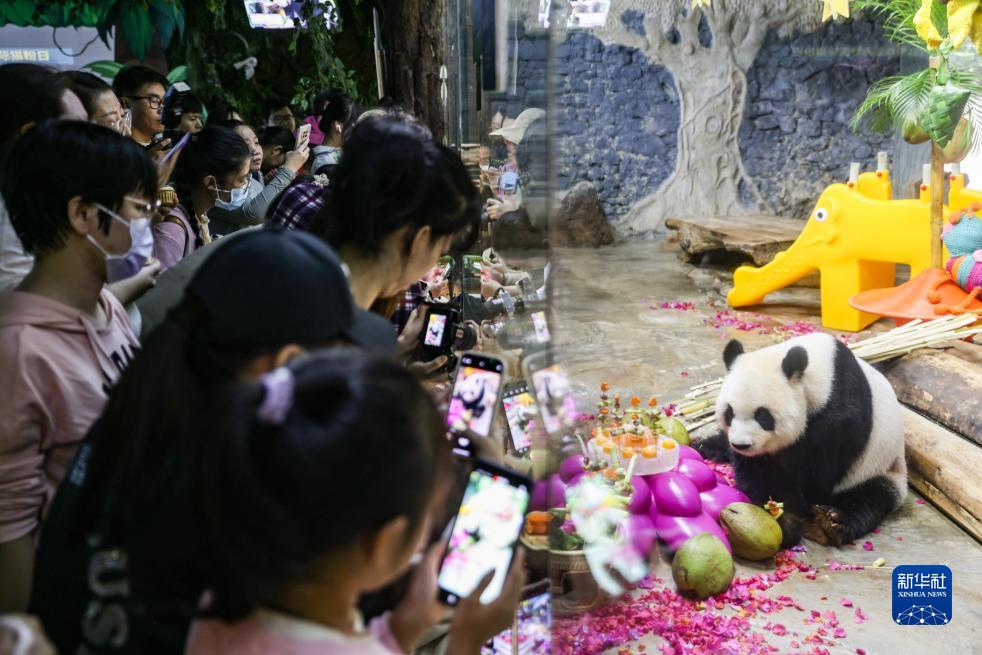當(dāng)日,為慶祝大熊貓“貢貢”和“舜舜”來到海南五周年,位于海口的海南熱帶野生動(dòng)植物園為這對(duì)“熊貓兄弟”準(zhǔn)備了玩具和竹筍、水果等美食,同時(shí)舉辦多種科普活動(dòng)和互動(dòng)游戲,吸引不少游客參加。