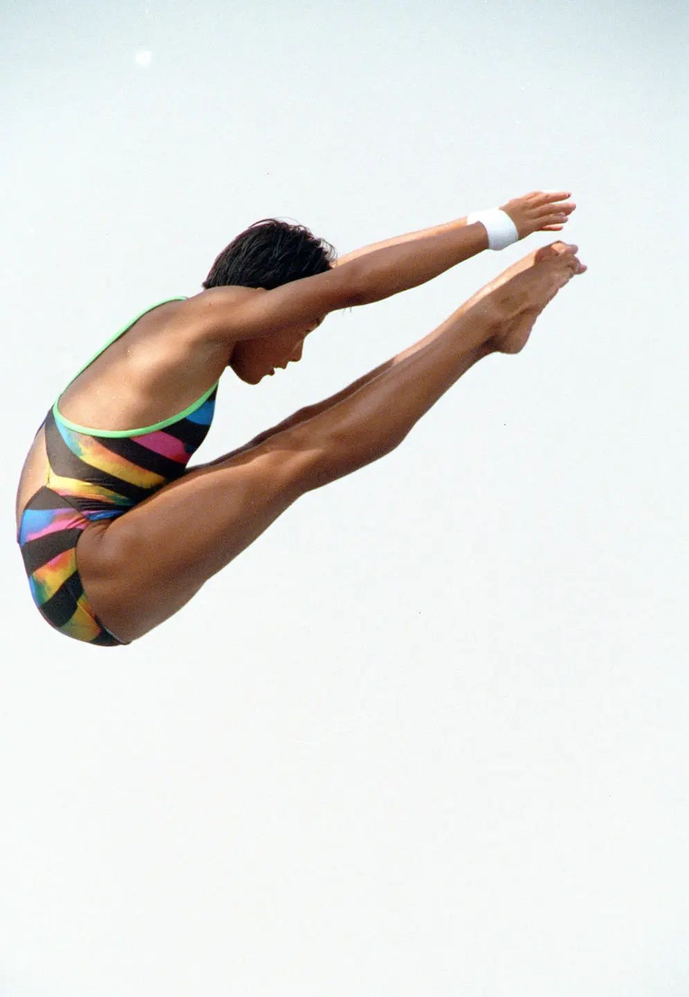 ↑伏明霞在1992年巴塞羅那奧運會上奪得女子十米臺冠軍。