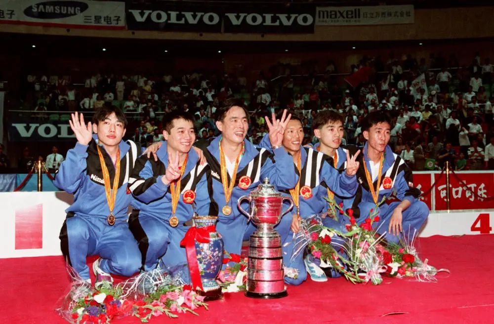 ↑1995年,中國男子乒乓球隊在第43屆世乒賽上奪回斯韋思林杯。