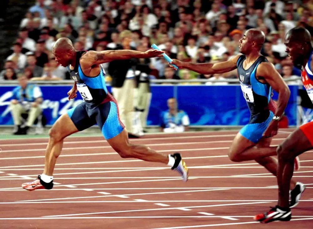 ↑美國隊獲得2000年悉尼奧運會男子4×100米接力金牌。
