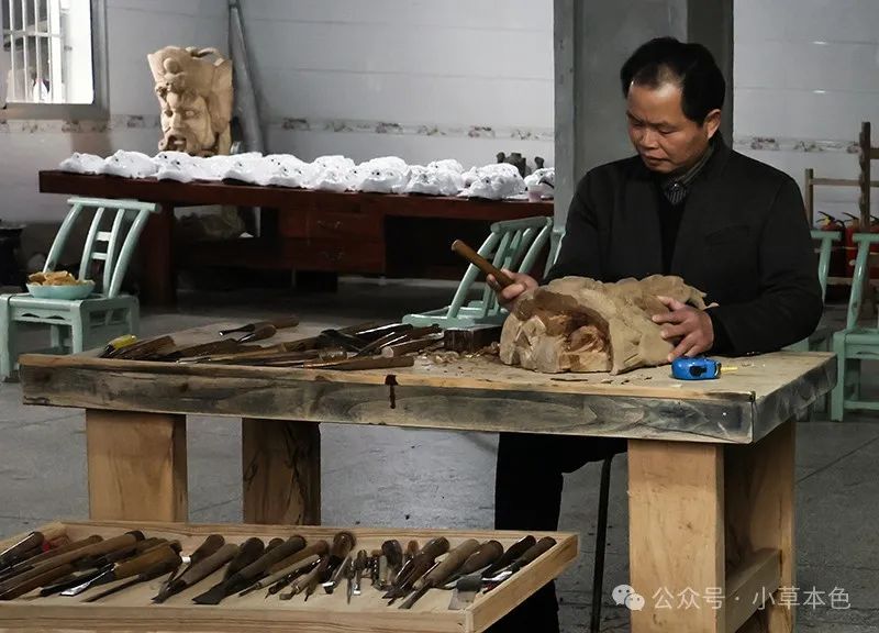 彭國(guó)龍是江西省萍鄉(xiāng)市湘東區(qū)臘市鎮(zhèn)救塘村人,是當(dāng)?shù)赜忻膬婢叩窨趟嚾撕蛢婢叩窨碳妓噦鞒腥?。萍鄉(xiāng)湘東儺面具風(fēng)格古樸細(xì)膩,工藝復(fù)雜講究,2006年被列入第一批國(guó)家級(jí)非物質(zhì)文化遺產(chǎn)名錄。彭國(guó)龍子承父業(yè),14歲就跟隨父親學(xué)習(xí)油漆、雕儺等技藝,至今已近40載,在繼承傳統(tǒng)儺面具雕刻技法的同時(shí),還揉入現(xiàn)代元素,使作品貼近生活、彰顯個(gè)性。對(duì)于彭國(guó)龍來(lái)說(shuō),儺面具雕刻已不僅是謀生工具,更是一種對(duì)傳統(tǒng)儺文化的繼承和弘揚(yáng)