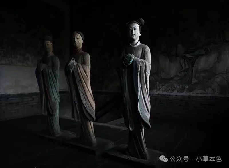 2024年3月26日,身著古代服飾的晉祠博物館工作人員被晉祠圣母殿里的古代侍女彩塑像深深吸引