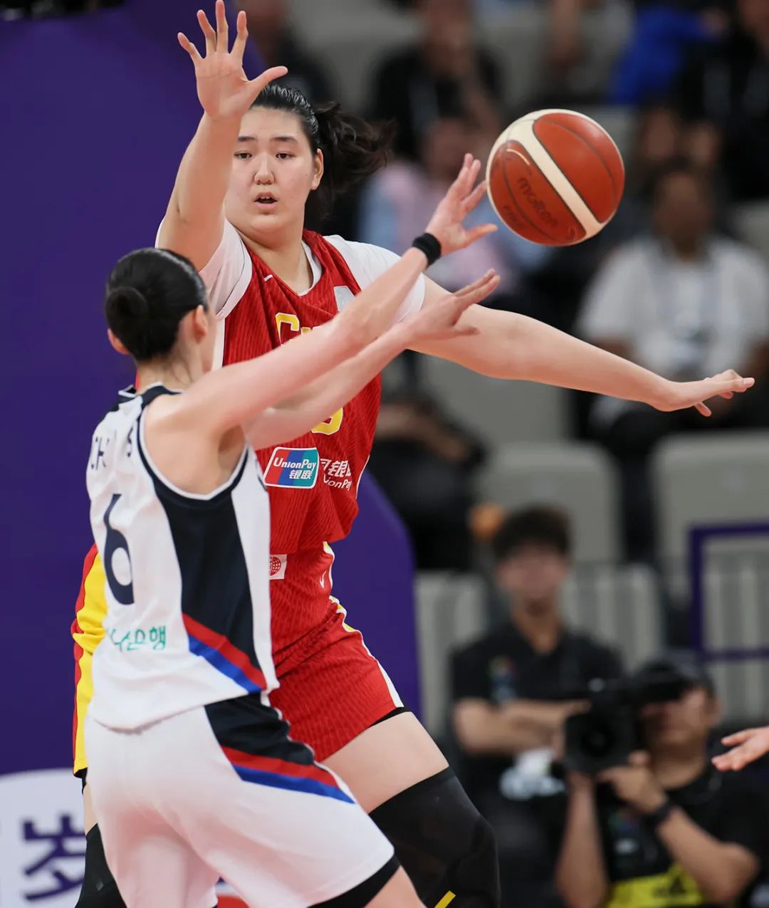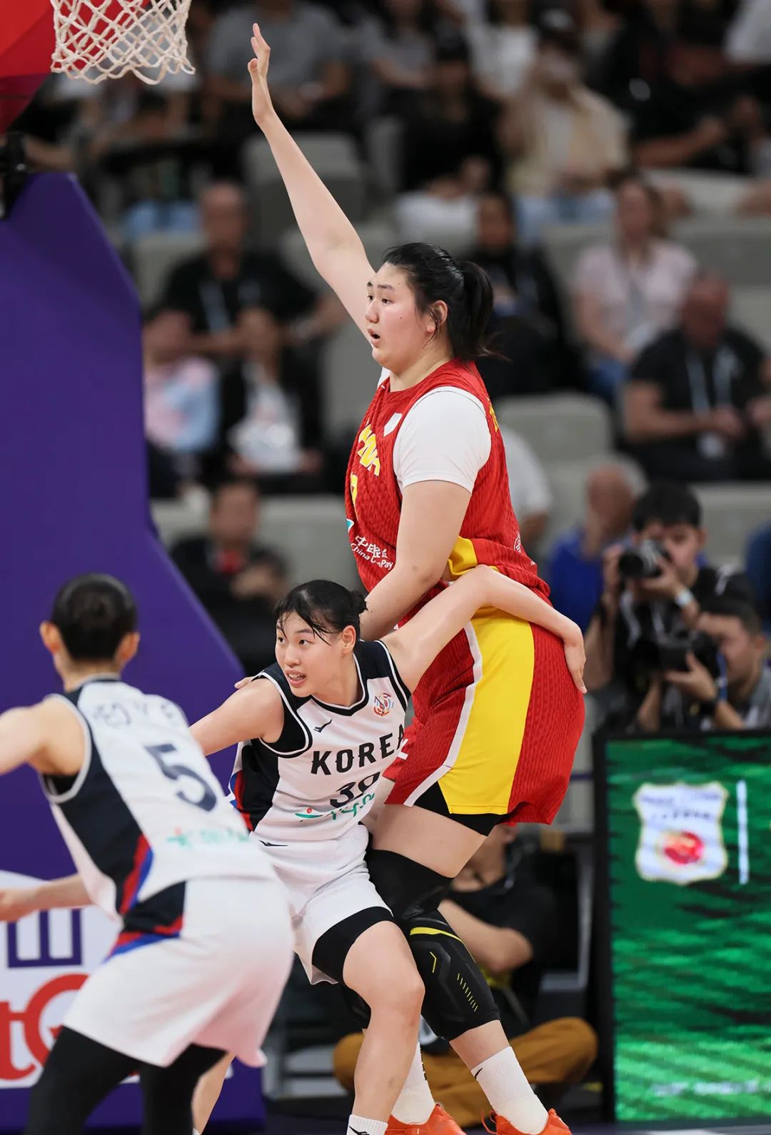 張子宇籃下要球準(zhǔn)備進(jìn)攻,韓國隊(duì)員拼命防守。蘭紅光攝
