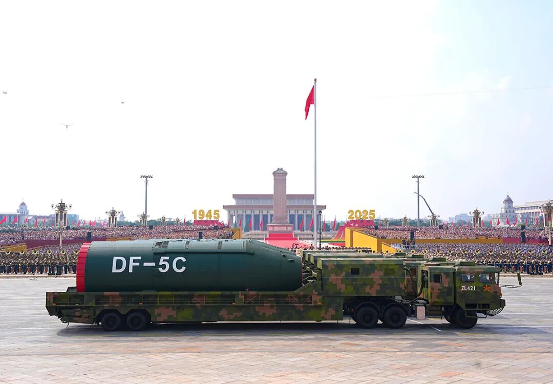 12臺大型導彈運輸車載著“東風-5C”液體洲際戰(zhàn)略核導彈浩蕩而來。