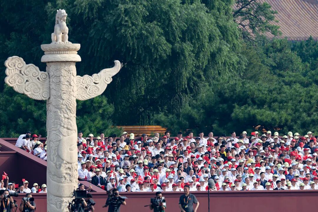 考慮到更換鏡頭的時間限制,我攜帶了三臺機身和五支鏡頭,還準備了梯子。這些器材對女性攝影師而言是不小的負重。由于東臨觀點位較低且不允許站立拍攝,攜帶的梯子也無法使用,我意識到自己能夠捕捉的畫面十分有限。轉機出現在升國旗環(huán)節(jié)——當全體起立時,我獲得了整場活動中唯一的站立拍攝機會。我用長焦鏡頭遠距離捕捉下軍樂隊和觀禮群眾共聚畫面的瞬間。當升旗手將國旗拋向空中的那一刻,所有人的目光都聚焦于五星紅旗,這個場景既象征著盛大閱兵式全球矚目,也寓意著中國的崛起受到世界關注。