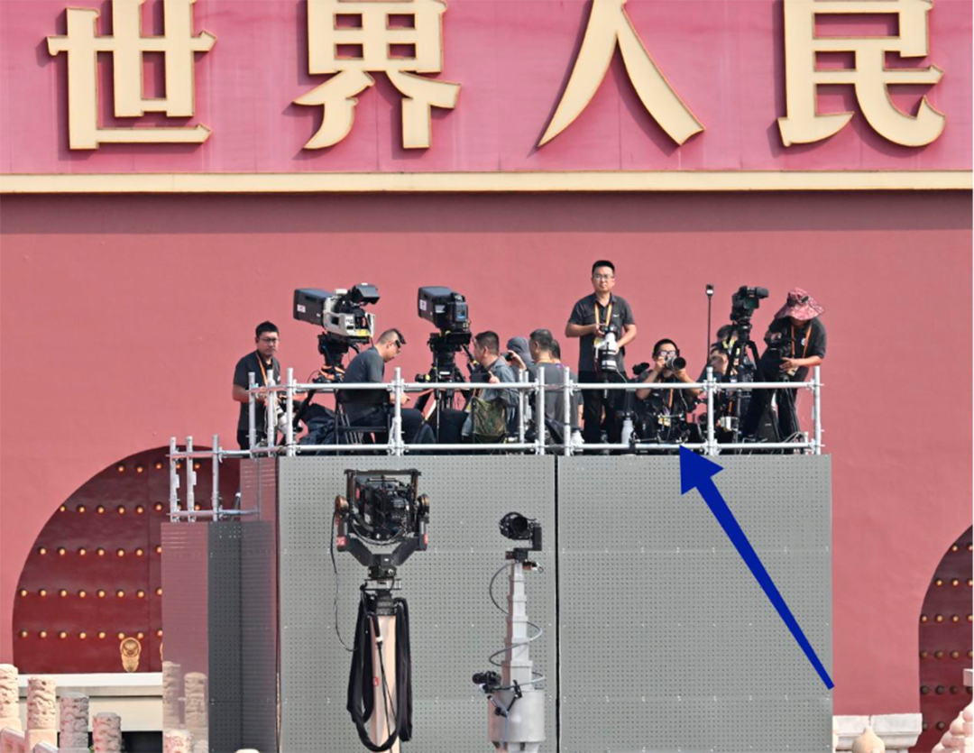 這個鐵架子看似一個整體,實際上是挨在一起的四個鐵架子。高低各有錯落,分屬不同的部門,正面能看見的兩個,左邊是央視的,右邊是新華社的,箭頭指向的就是我。背面看不見的還有兩個鐵架子。鐵架子前面,還有兩個升降機,左邊是央視的,右邊是新華社的,在活動開始之后,會升高進行拍攝。