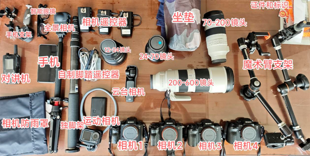 上去之后,我把一支廣角鏡頭和一支中焦鏡頭,分別裝在兩個機身上,用魔術臂支架,固定好,再連接到腳踏遙控器上,這樣,我就可以用腳控制兩臺相機,解放出來的雙手,用長焦鏡頭來拍攝。