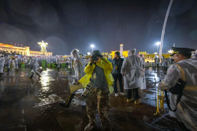 第一次閱兵彩排時(shí),我的心情緊張到了極點(diǎn)。不僅位置未知,還預(yù)報(bào)有雨。我除了給自己準(zhǔn)備雨衣,還給設(shè)備置備了三套雨具。50斤的攝影設(shè)備扛在肩上,心里既擔(dān)心安檢不讓帶,又害怕少帶了設(shè)備拍不好。第二次彩排,我趕緊購置了梯子,希望能獲得更好的拍攝角度。第三次彩排,過了安檢我就拼命往點(diǎn)位沖,可沒想到位置被燈柱、音箱擋著,無奈之下,我又扛著梯子、相機(jī)四處尋找合適的角度,只為了能在規(guī)定時(shí)間內(nèi)將這珍貴的瞬間完美地拍攝下來。
