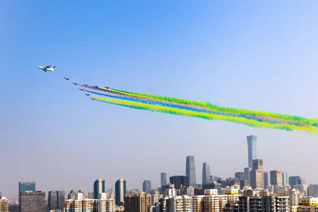 2019年新中國成立70周年閱兵上的空警2000、殲10編隊(duì)拉彩煙。岳書華攝