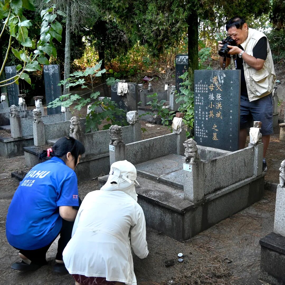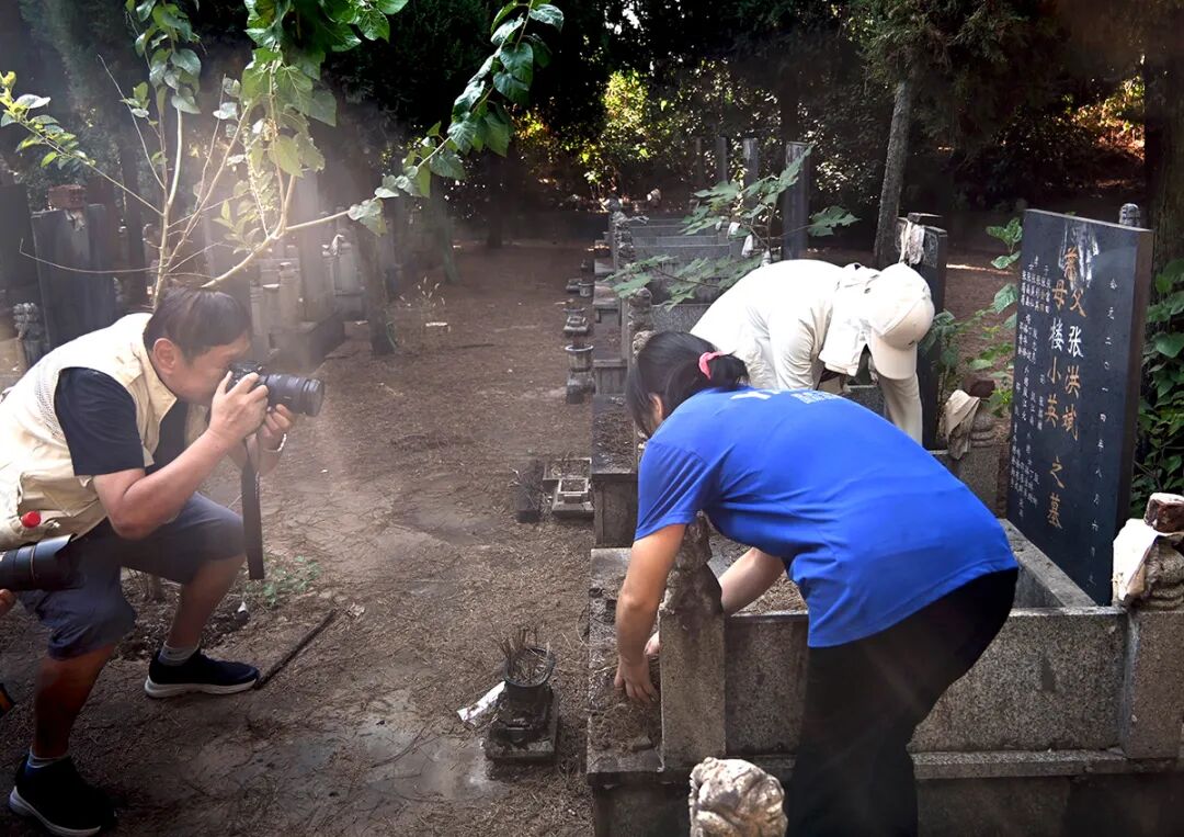 2025年10月11日,在浙江省金華市東關(guān)村公墓,被張洪斌夫婦撫養(yǎng)長大的張菊菊(前)清理兩位老人的墓碑,李曉果在旁邊拍攝。 王頌 攝