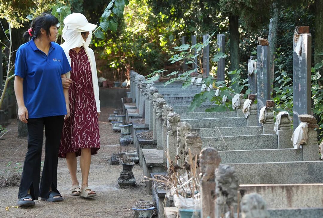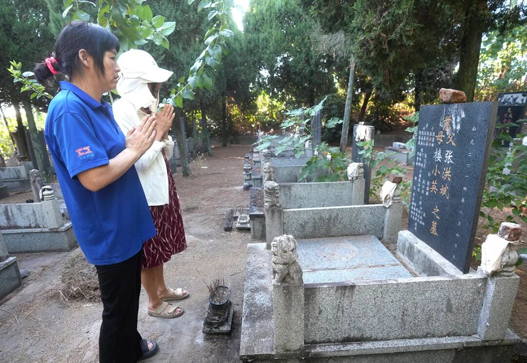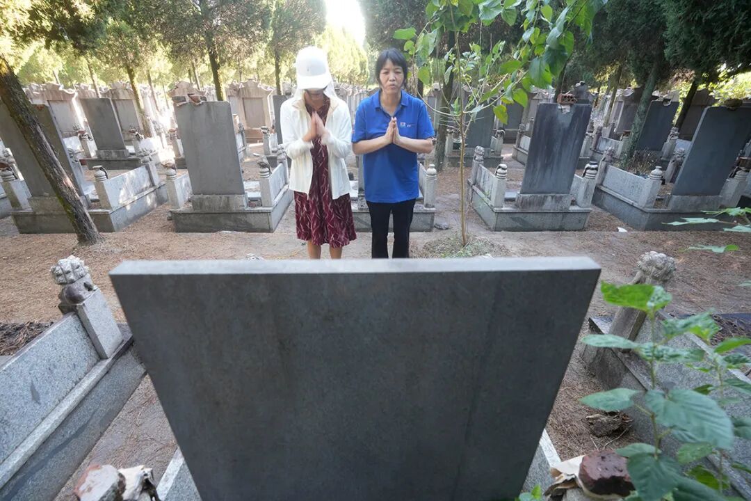 2025年10月11日,被張洪斌夫婦撫養(yǎng)長大的張菊菊(左)和另一名當(dāng)年被張氏夫婦撫養(yǎng)長大的“棄嬰”到公墓去看望安葬于此的兩位老人。 李曉果 攝