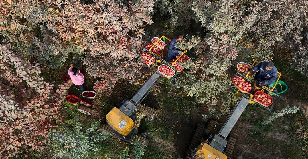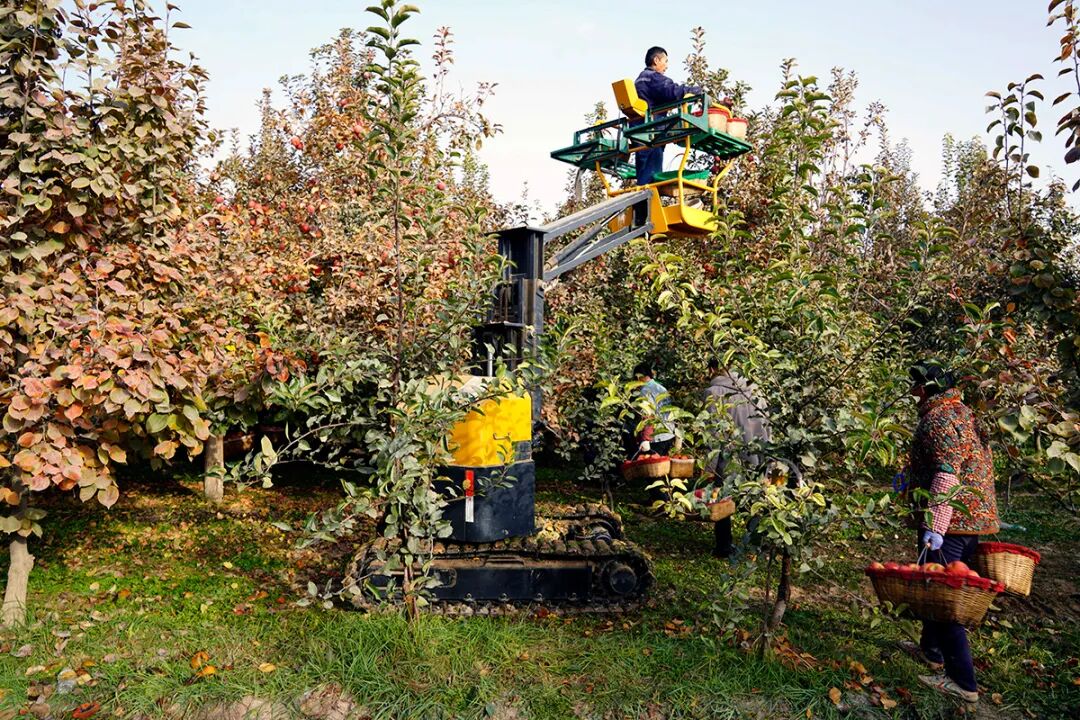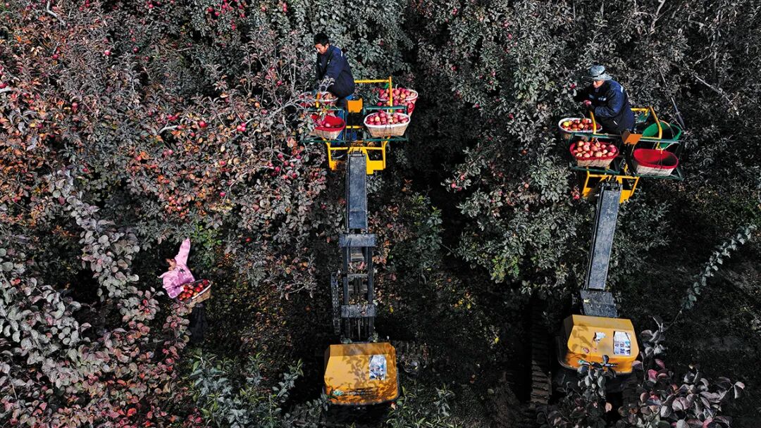 10月23日,在新疆生產(chǎn)建設(shè)兵團(tuán)第一師阿拉爾市六團(tuán)雙城鎮(zhèn)三連職工利用采摘機(jī)在采摘蘋(píng)果。人民政協(xié)報(bào)記者 齊波攝