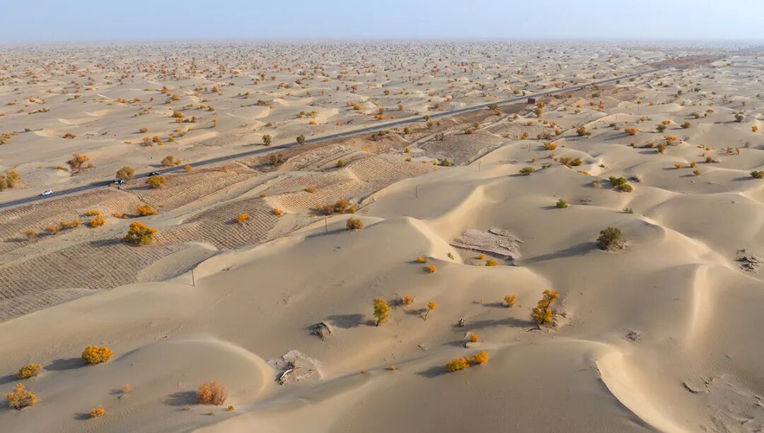 10月23日,塔克拉瑪干沙漠,人工草方格與胡楊共同構(gòu)筑起一道沙漠生態(tài)防線。科普時(shí)報(bào)記者 季春紅攝