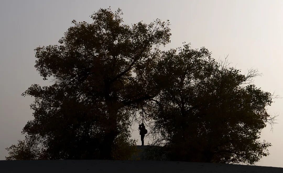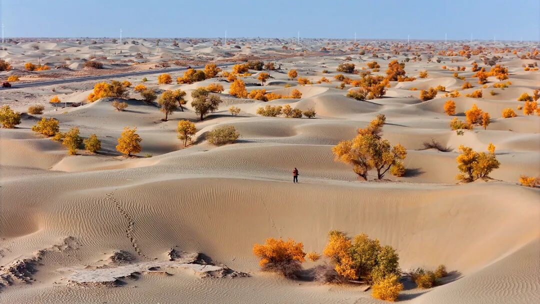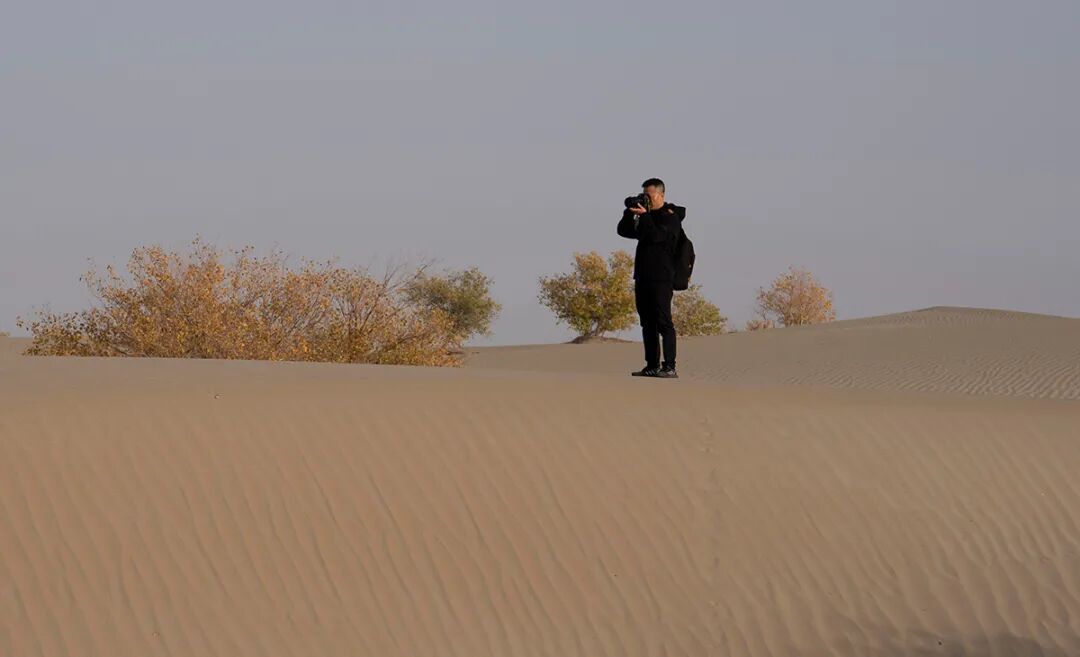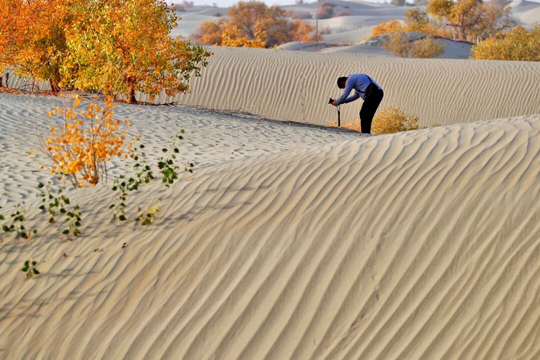10月23日,在新疆生產(chǎn)建設(shè)兵團(tuán)第一師阿拉爾市的G580國(guó)道阿拉爾至和田沙漠公路(簡(jiǎn)稱“阿和公路”)附近,一名男子正在拍攝胡楊林。金秋十月,新疆生產(chǎn)建設(shè)兵團(tuán)第一師阿拉爾市的胡楊林迎來(lái)了最佳觀賞季。中國(guó)旅游報(bào)記者陳晨 攝