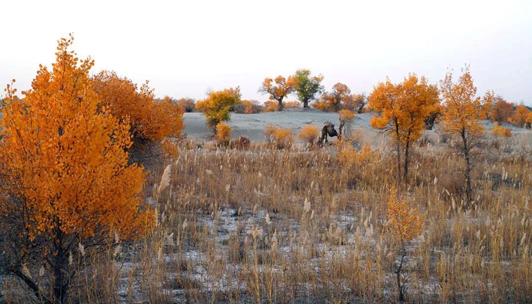 10月24日,新疆阿拉爾市塔河濕地,固定的沙丘、金黃色的胡楊與清澈的水面相映成趣。科普時(shí)報(bào)記者 季春紅攝