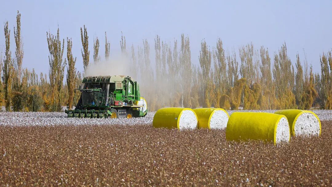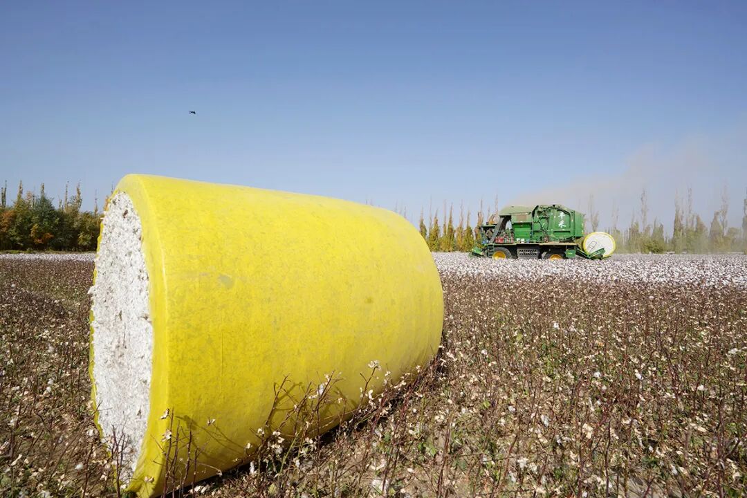 十月的新疆是收獲的季節(jié),在兵團(tuán)一師管轄地,大型機(jī)械在收割棉花并打捆待運(yùn)。趙樹(shù)宴 攝