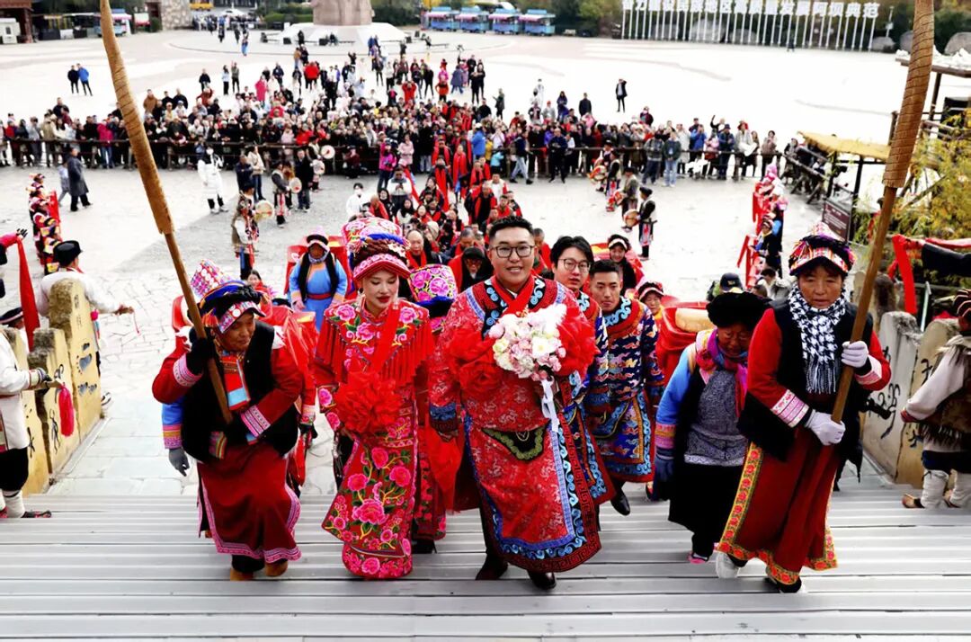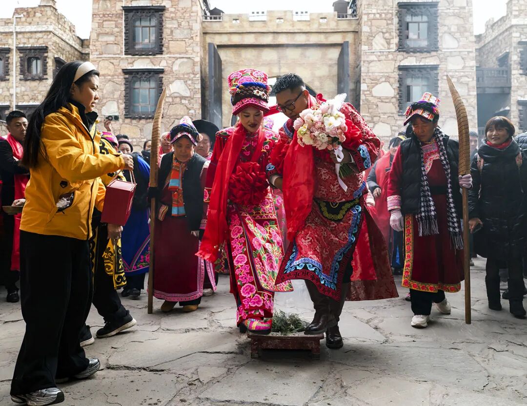 11月20日,四川阿壩州茂縣古羌城為一對新人舉辦了傳統(tǒng)的羌族婚禮。