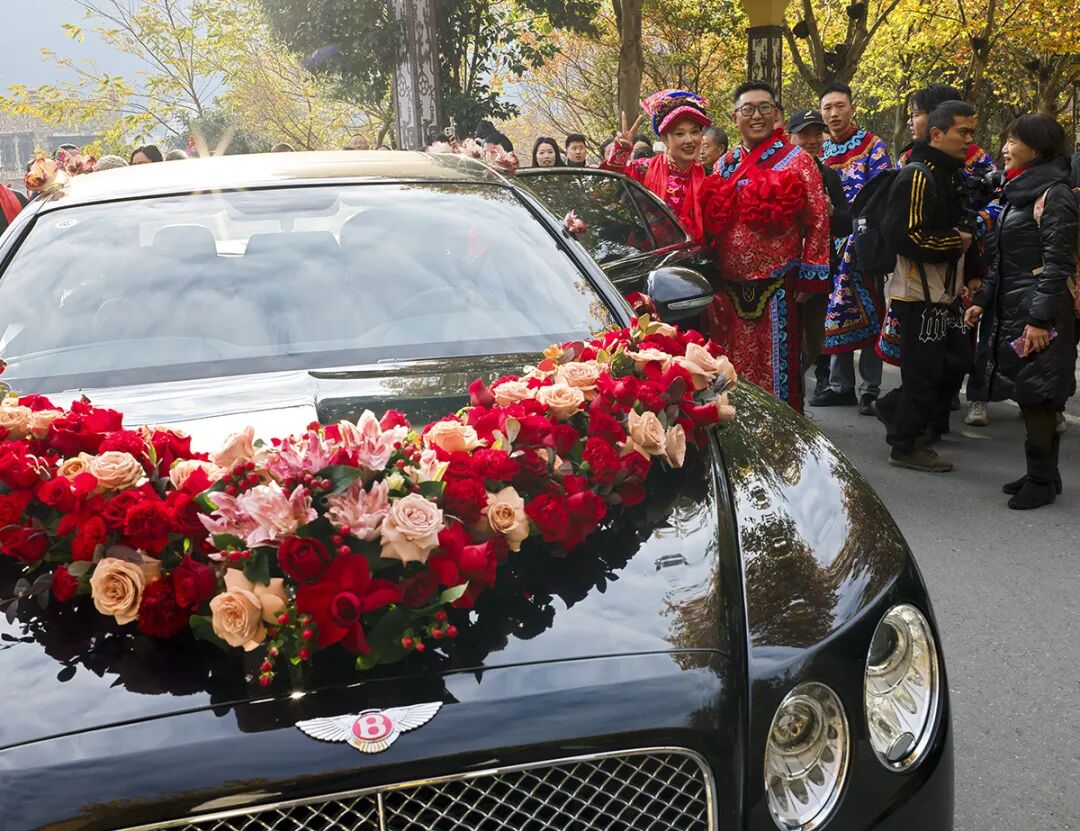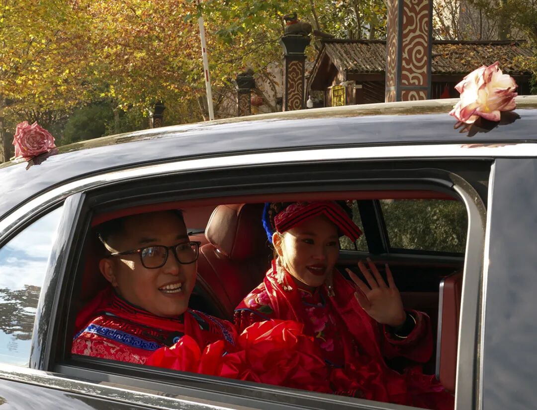 新郎和新娘準(zhǔn)備乘婚車離開。