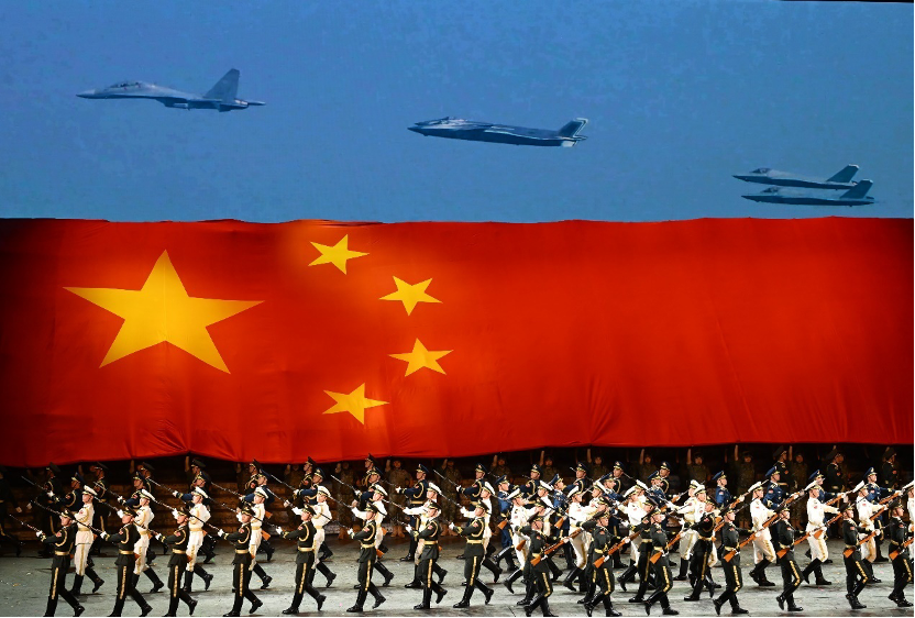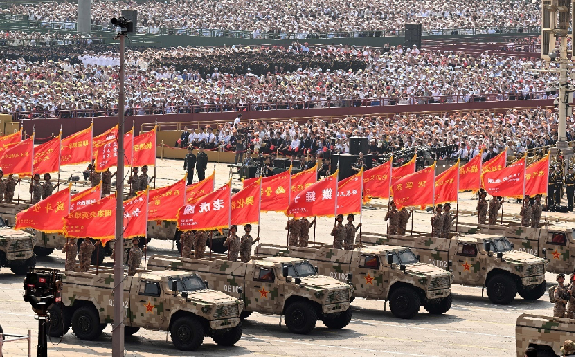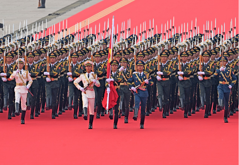 高擎黨旗、國旗、軍旗,中國人民解放軍儀仗方隊(duì)闊步走來。