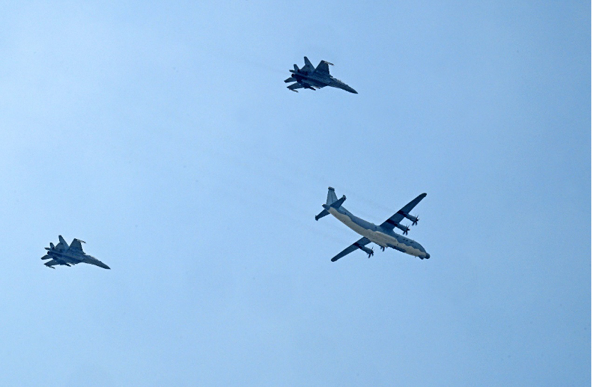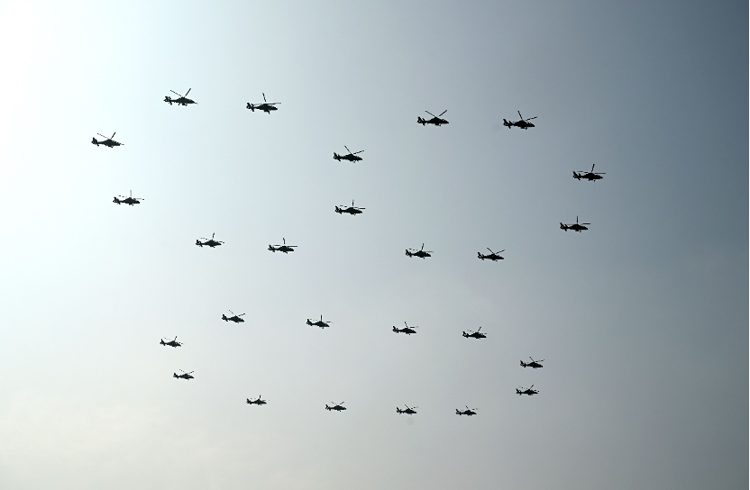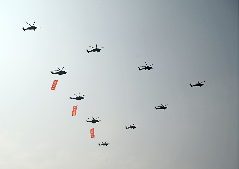 3架直升機(jī)分別懸掛正義必勝、和平必勝、人民必勝條幅。