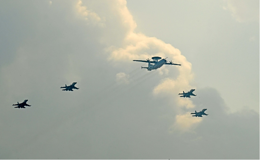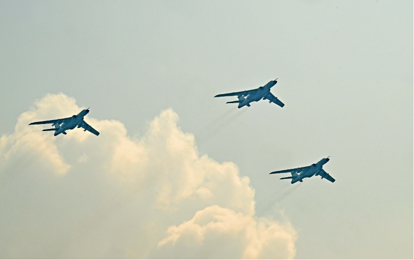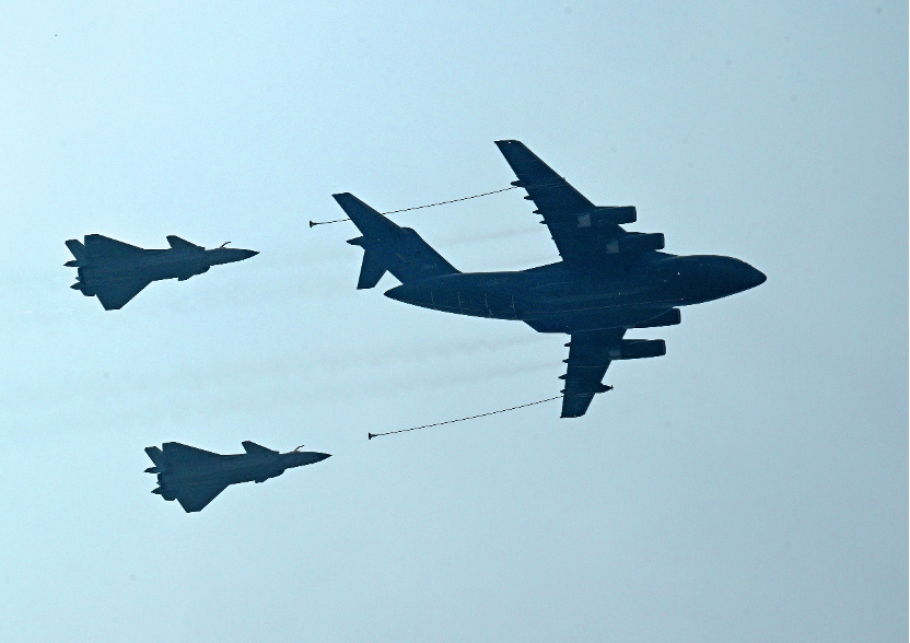 7架殲10表演機(jī)拉出14道彩煙寓意中華民族14年可歌可泣的抗戰(zhàn)歷程和14億中國人民奔向強(qiáng)國復(fù)興的光明前景。