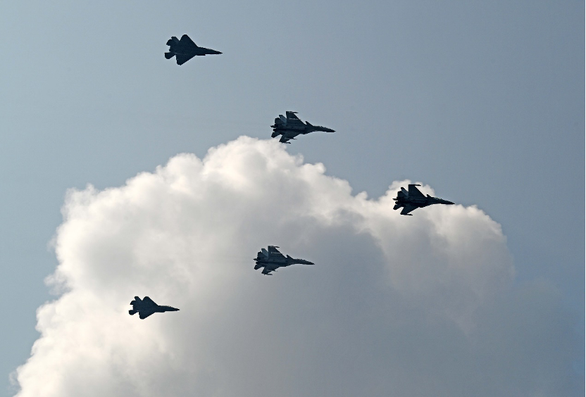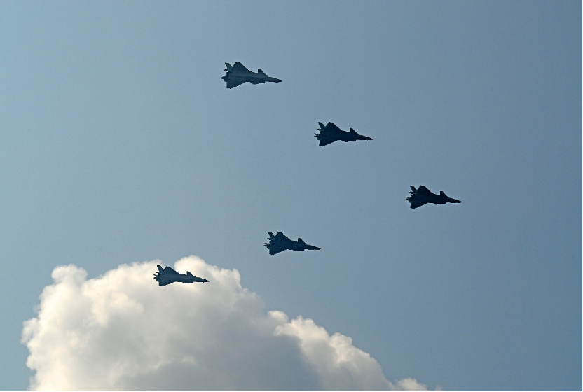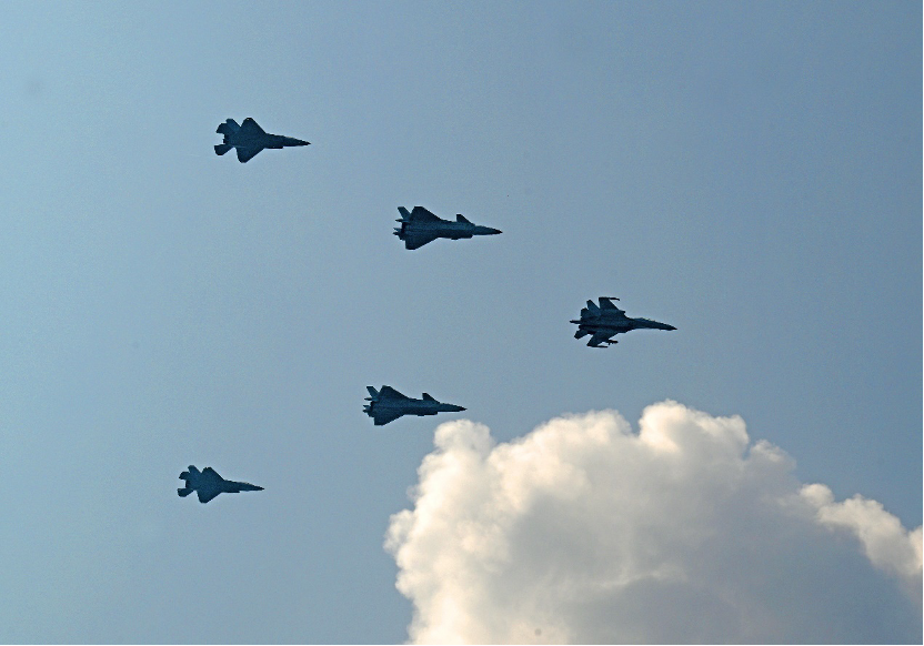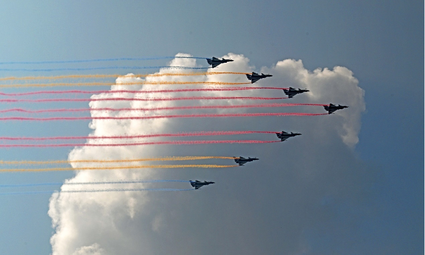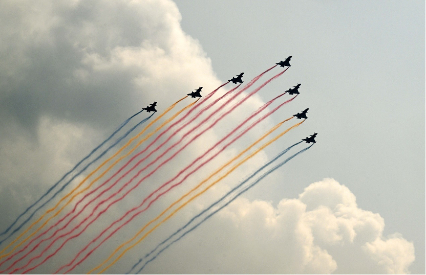 7架殲10表演機(jī)拉出14道彩煙寓意中華民族14年可歌可泣的抗戰(zhàn)歷程和14億多中國人民奔向強(qiáng)國復(fù)興的光明前景。