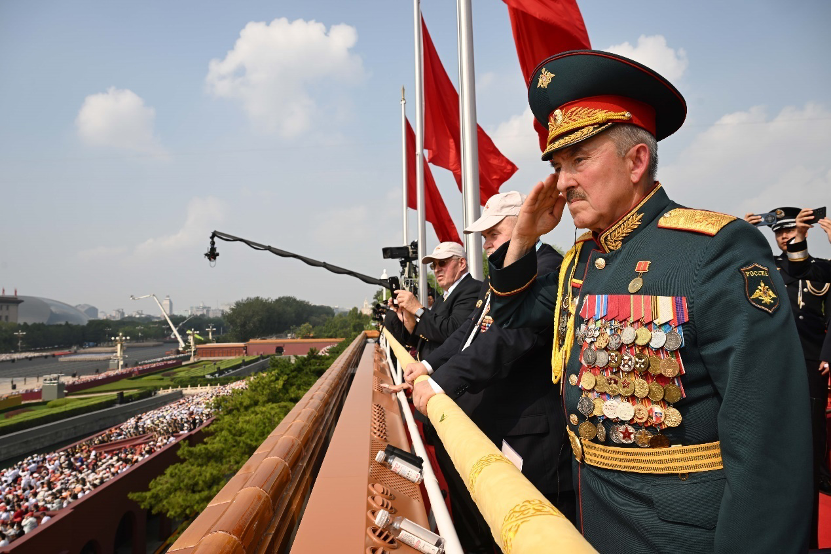 戰(zhàn)旗方隊(duì)經(jīng)過時(shí),蘇聯(lián)紅軍老戰(zhàn)士加·季·扎維齊奧諾夫兒子、退休中將扎維齊奧諾夫·尤里起身敬禮。