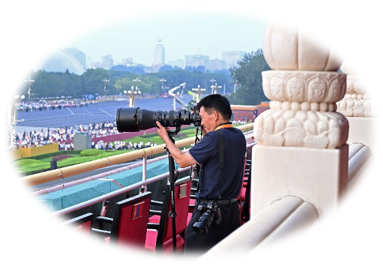 演練時(shí)登上天安門城樓的那一刻,視野開闊而震撼,想起無數(shù)的輝煌時(shí)刻、歷史瞬間都是在這里定格,內(nèi)心充滿了自豪與期待。然而,隨著影像設(shè)備和拍攝手段的不斷更新,攝影記者也面臨著越來越多的問題和挑戰(zhàn),面向長安街望去,滿眼都是高聳密集的攝像升降塔和電視搖臂,它們將城樓前的馬路分割成了數(shù)個(gè)大小不一的間隔空間,很難拍到干凈滿意的大場景畫面,如何在這一大片紛繁復(fù)雜中尋找出一份秩序,經(jīng)過反復(fù)比較觀察,我發(fā)現(xiàn)其中有一個(gè)稍寬點(diǎn)的縫隙,就決定利用好這個(gè)縫隙。